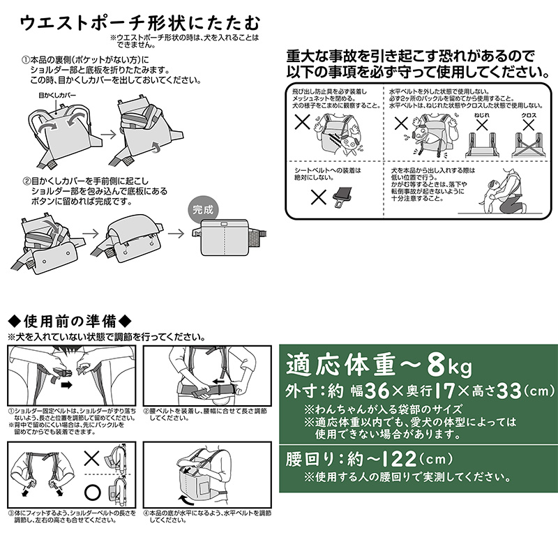 記載以上の体重の犬には使用しないでください。 人やペットが破片等を誤飲しないように注意してください。万一、誤飲した場合は各医師に相談してください。 空袋は幼児・子供・ペットがおもちゃにしないように注意してください。 幼児・子供には絶対に使用させないでください。 本品を正しく使用してください。使用方法の誤りや分解・修理・改造等による事故については、一切責任を負いません。 本品の中に人が入らないでください。 本品を使用したまま車両等の運転をしないでください。 犬を長時間入れた状態にしないでください。 本品に犬を入れた状態で車中に放置しないでください。特に夏季は車中が高温になりますので注意してください。 犬の様子をこまめに観察しながら使用してください。 飼い主の目の届く範囲で使用してください。 落下や転倒事故が起きないように十分注意してください。 足元が見えにくいので気をつけてください。 使用前に破損箇所がないか必ず確認し、傷みや破損がある場合は使用を中止してください。 犬が嫌がる場合は、無理に使用しないでください。 事故や破損の原因になりますので、ペットが本品をかんだり、引っかく等しないように注意してください。 犬が逃げ出さないように、開閉には注意してください。 使用時には飛び出し防止具を首輪等に装着し、メッシュネット部を閉めてください。 腰ベルト・ショルダー固定ベルト・水平ベルトのバックルが確実に留められていることを確認してから使用してください。 バックルを留める際は、手や毛をはさまないように注意してください。 汗・水ぬれや摩擦等で色落ちする場合があります。特に薄い色の服や薄い毛色の犬には注意してくだい。 床面の材質等によっては底面のボタンのキズ・跡等が残る場合がありますので注意してください。 火気や水気のそばでの使用や保管はしないでください。 幼児・子供・認知症の方・ペットのふれない所に保管してください。 【保管上の注意】 使用後はいつも清潔に保ってください。汚れた場合は乾いた布等でふき取ってください。 熱湯・漂白剤・ベンジン・シンナー・アルコール等は使用しないでください。 長期間使用しない場合は、型くずれしないように注意して保管してください。 火気や水気のそば・直射日光・高温多湿の場所をさけて保管してください。 幼児・子供・認知症の方・ペットのふれない所に保管してください。 |