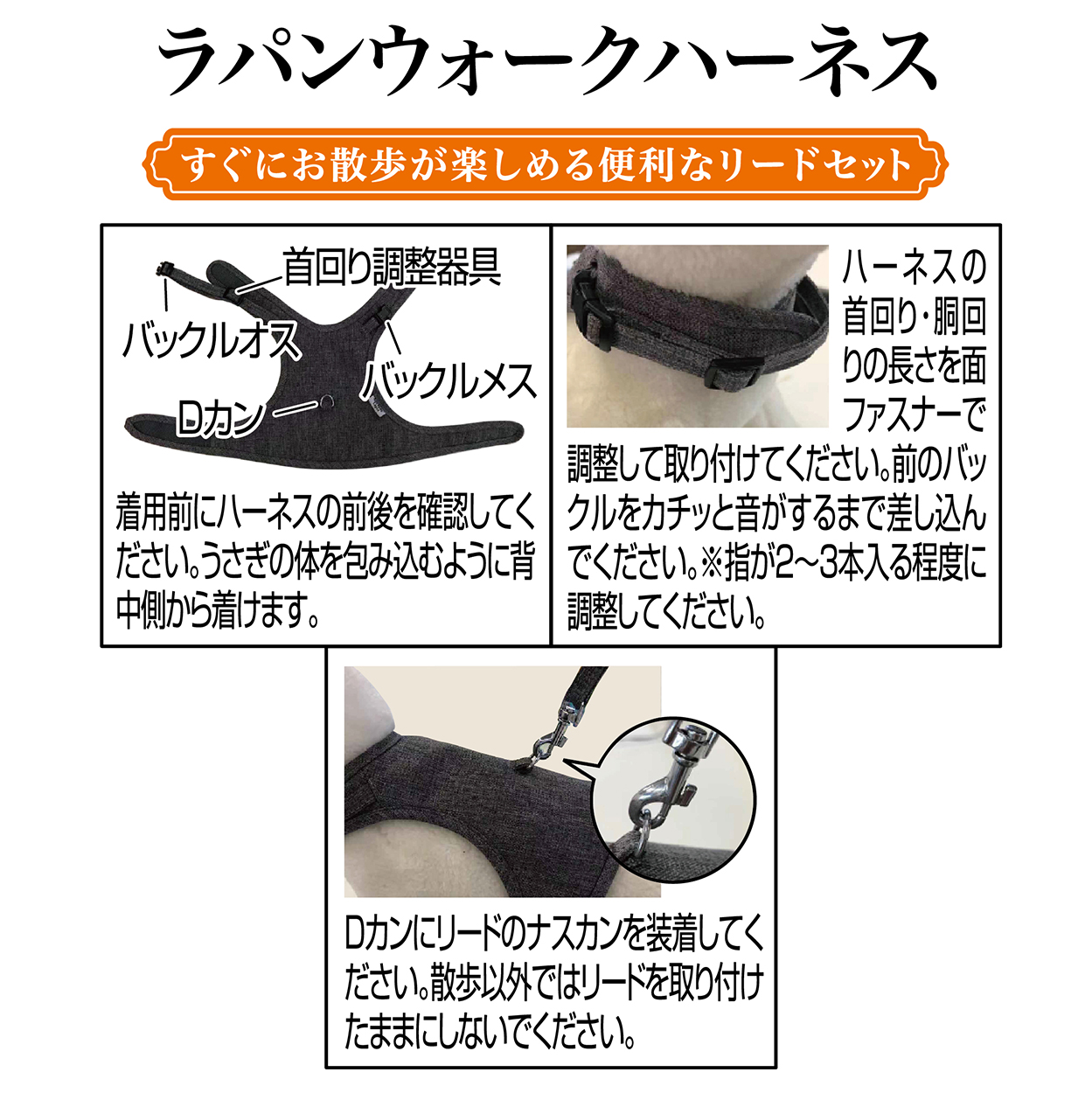 背中側からとめるのでうさぎを怖がらせず装着がしやすい
