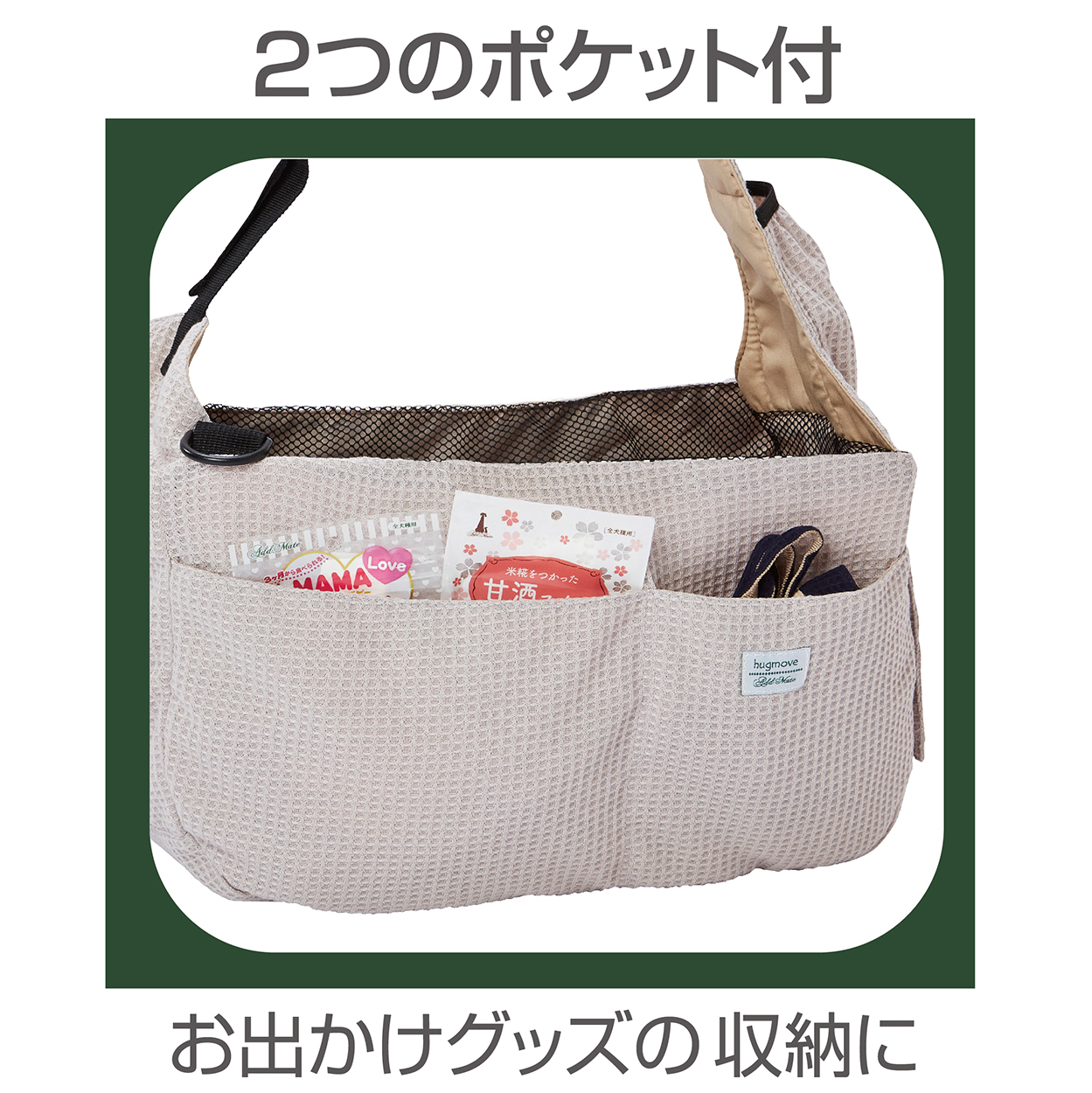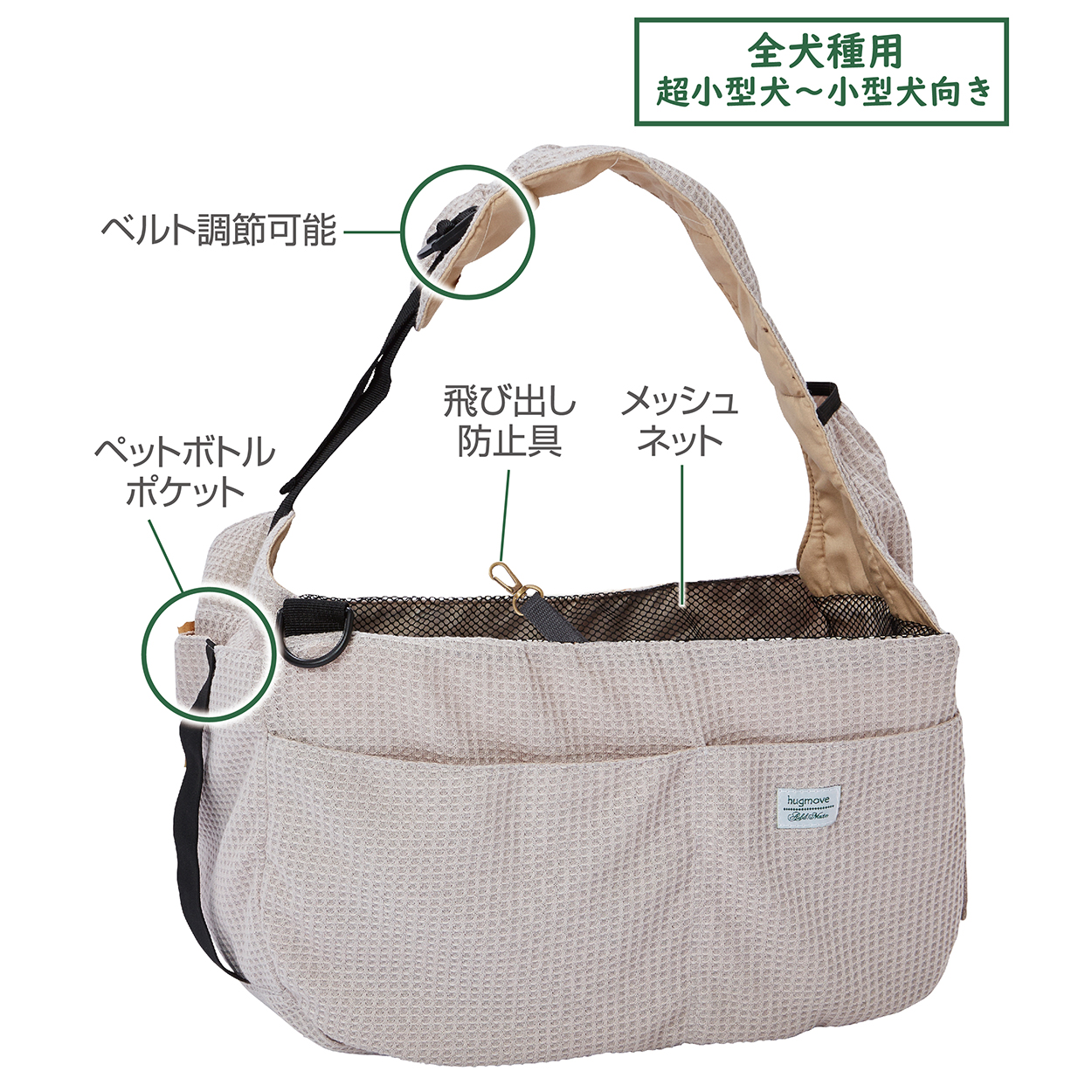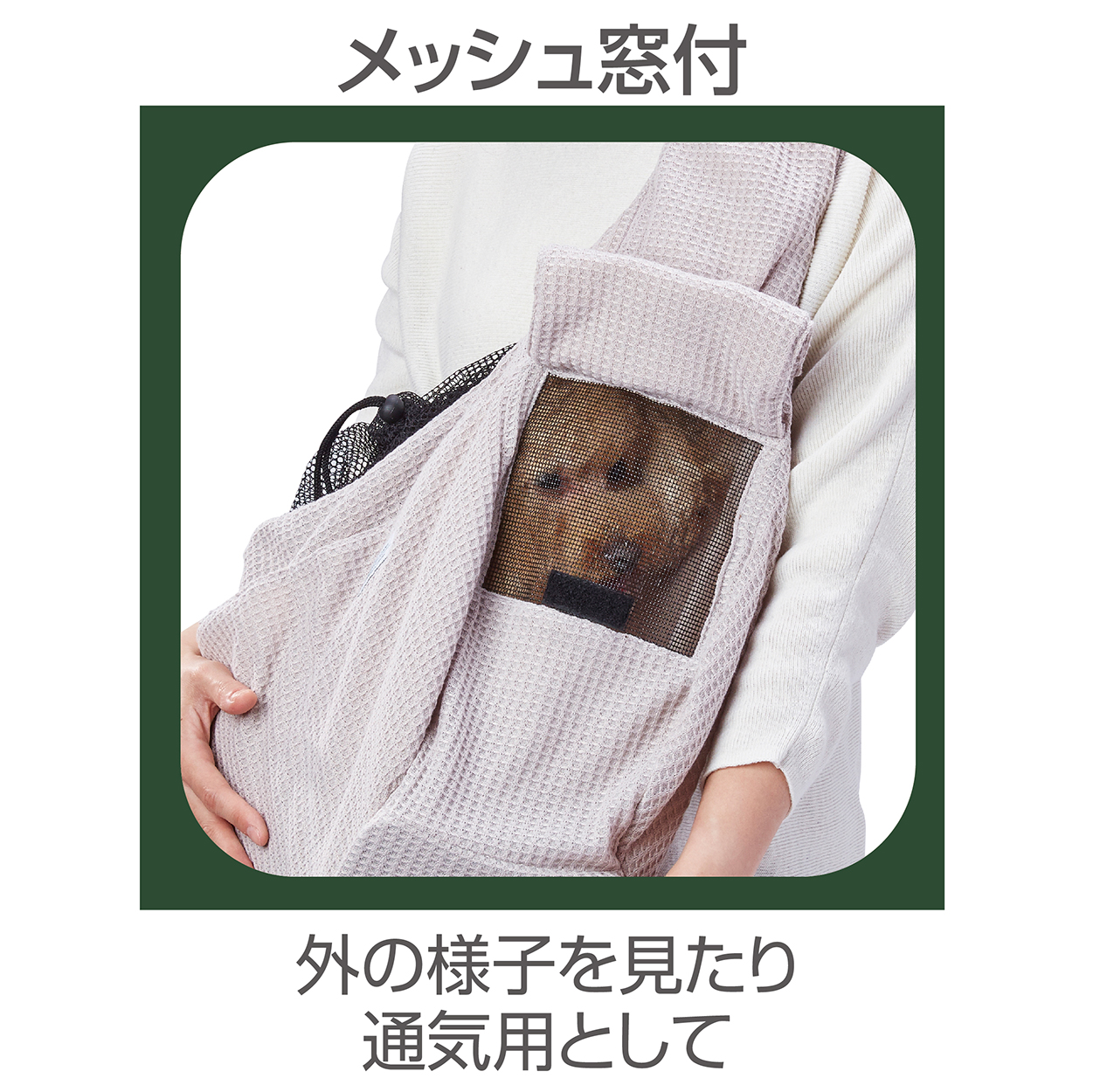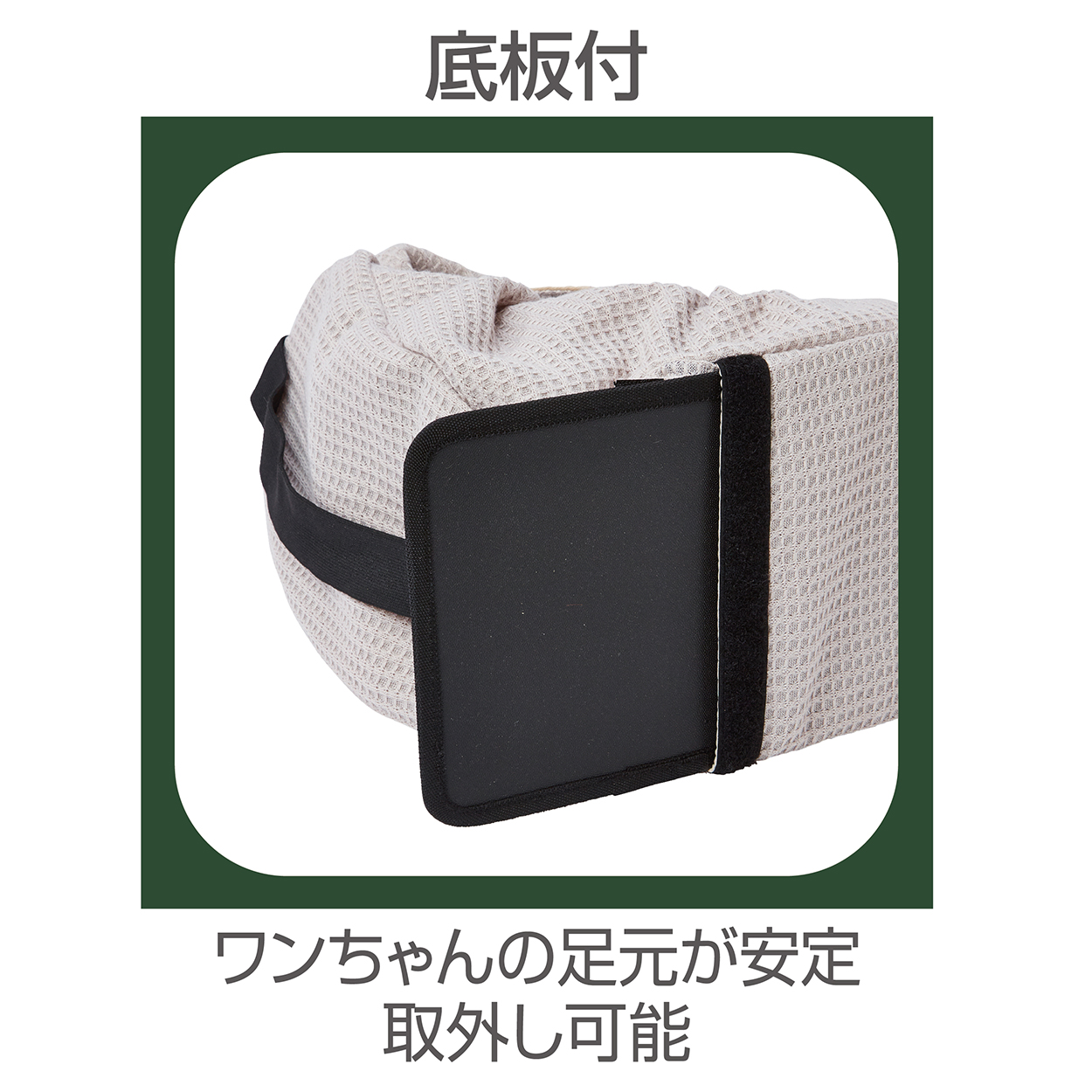 温かみのある見た目と肌触りの良さが魅力のワッフル生地をキャリー表生地に使用。散歩時やお出かけ先にも使いやすいコンパクトにたためるスリングキャリー。使用しない時の持ち運びの負担も軽減。わんちゃんの足元が安定する底板付。