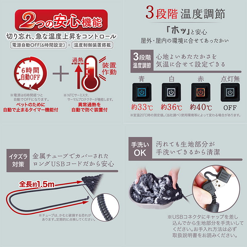・温度制御装置、電源自動OFF(6時間)、コードのイタズラ対策に金属製チューブ採用など嬉しい安心設計