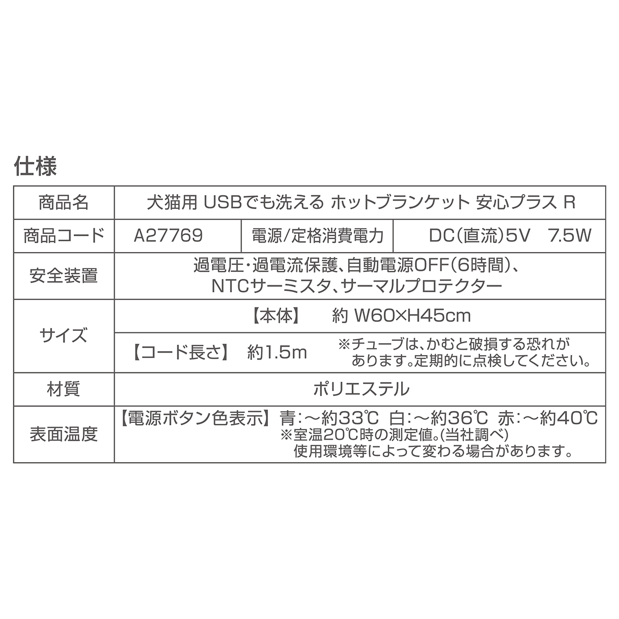 過電圧・過電流保護、自動電源OFF(6時間)、NTCサーミスタ、サーマルプロテクター
