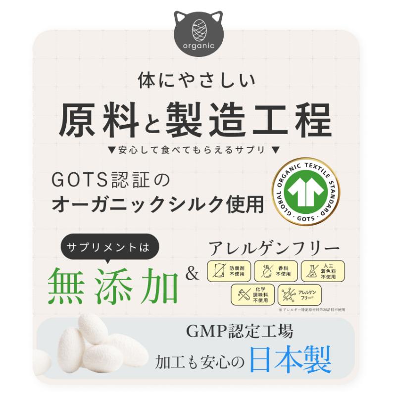 | 素材 | <原材料> シルクフィブロインタンパク質 <保証成分> たんぱく質0.09g、脂質0g、炭水化物0g、シルクフィブロイン90mg(推定値)(1包3gあたり) |