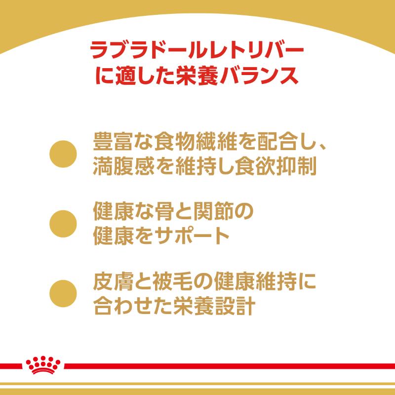 避妊・去勢手術を受けたラブラドールレトリバーの特別な栄養要求に対応し、高タンパク質(30%)および低脂肪(11%)に調整*し、また食物繊維を配合することで、満腹感と健康的な体重の維持をサポートします。*ロイヤルカナン製品 マキシアダルト成犬用と比較して、タンパク質 約17%増、脂肪 約40%減