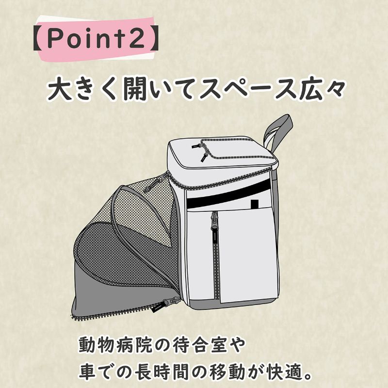 病院での待ち時間やドライブ時に前面を広げて快適に過ごせるリュックキャリー。