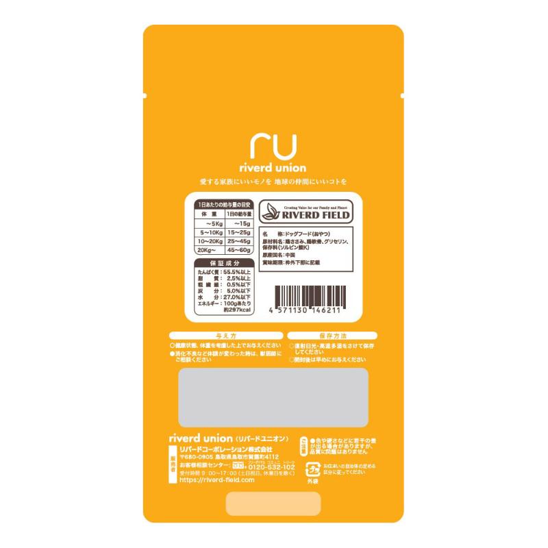| 素材 | <原材料> 鶏ささみ、鶏軟骨、グリセリン、保存料(ソルビン酸K) <保証成分> たんぱく質55.5%以上、脂質2.5%以上、粗繊維0.5%以下、灰分5.0%以下、水分27.0%以下 <エネルギー> 約297kcal/100g |