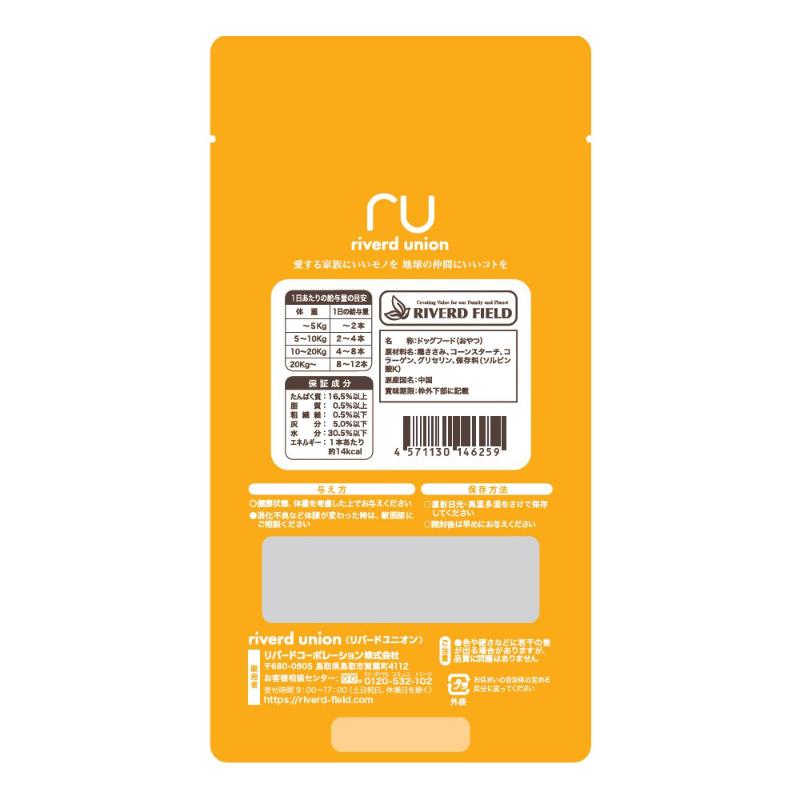 | 素材 | <原材料> 鶏ささみ、コーンスターチ、コラーゲン、グリセリン、保存料(ソルビン酸K) <保証成分> たんぱく質16.5%以上、脂質0.5%以上、粗繊維0.5%以下、灰分5.0%以下、水分30.5%以下 <エネルギー> 約14kcal/1本 |