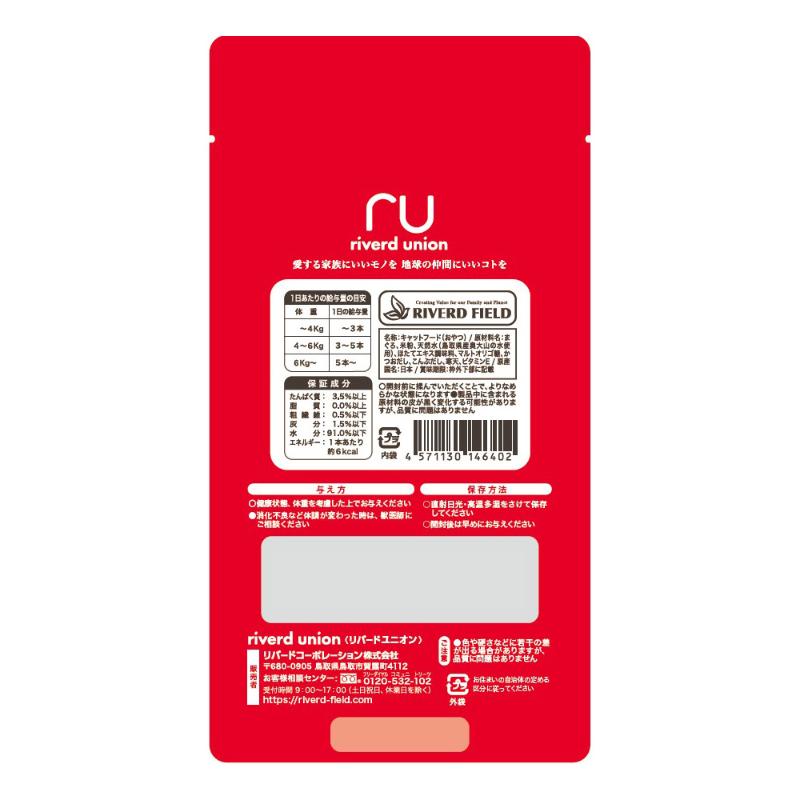 | 素材 | <原材料> まぐろ、米粉、天然水(鳥取県産奥大山の水使用)、ほたてエキス調味料、マルトオリゴ糖、かつおだし、こんぶだし、寒天、ビタミンE <保証成分> たんぱく質3.5%以上、脂質0.0%以上、粗繊維0.5%以下、灰分1.5%以下、水分91.0%以下 <エネルギー> 約6kcal/1本 |