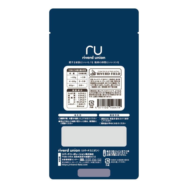 | 素材 | <原材料> 魚介類(まぐろ、かつお、サーモン、しらす)、米粉、天然水(鳥取県産奥大山の水使用)、ほたてエキス調味料、マルトオリゴ糖、かつおだし、こんぶだし、寒天、ビタミンE <保証成分> たんぱく質4.0%以上、脂質0.5%以上、粗繊維0.5%以下、灰分1.5%以下、水分90.5%以下 <エネルギー> 約6kcal/1本 |