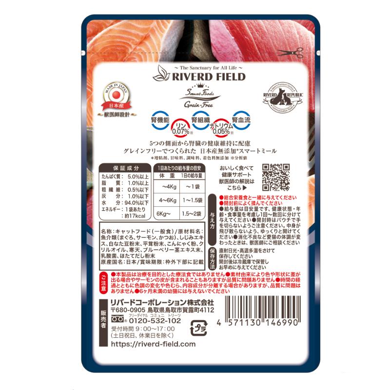 | 素材 | <原材料> 魚介類(まぐろ、サーモン、かつお)、しじみエキス、白なた豆粉末、平茸粉末、こんにゃく粉、クリルオイル、寒天、ブルーベリー茎エキス末、乳酸菌、ほたてだし粉末 <保証成分> たんぱく質5.0%以上、脂質1.0%以上、粗繊維0.5%以下、灰分1.0%以下、水分94.0%以下 <エネルギー> 約17kcal/袋 |