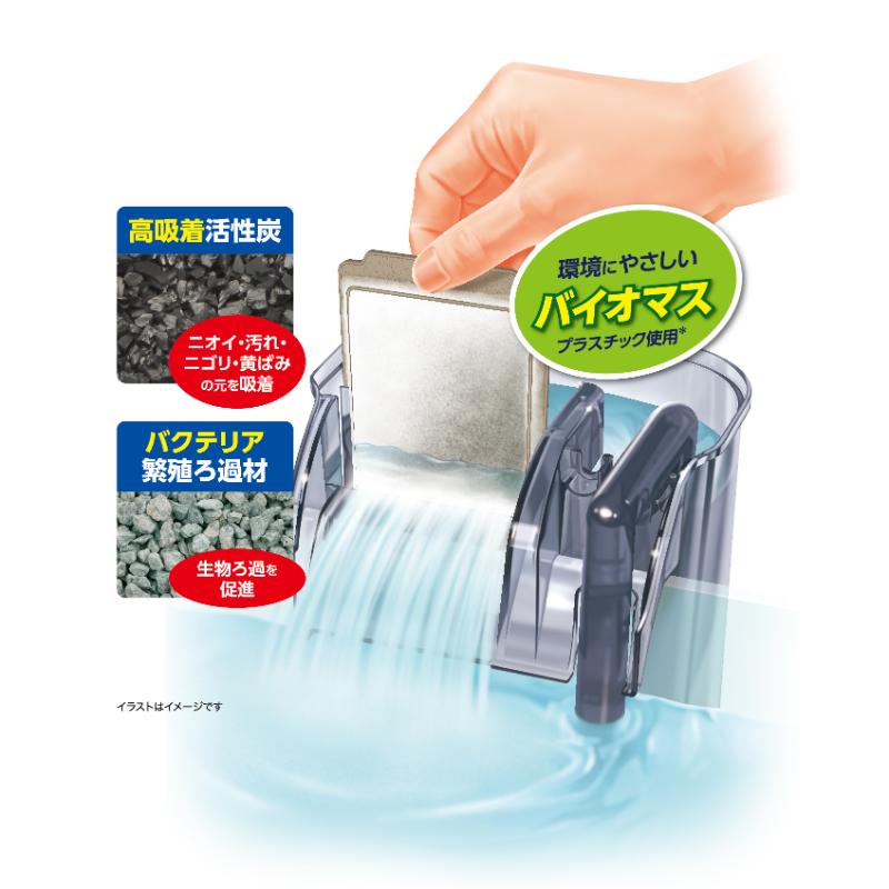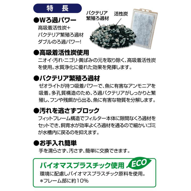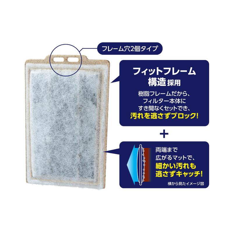 フィットフレーム構造でフィルター本体に隙間なくろ過材をセットでき、飼育水が効率よくろ過材を通るので細かいゴミが水槽内に戻るのを抑えます。