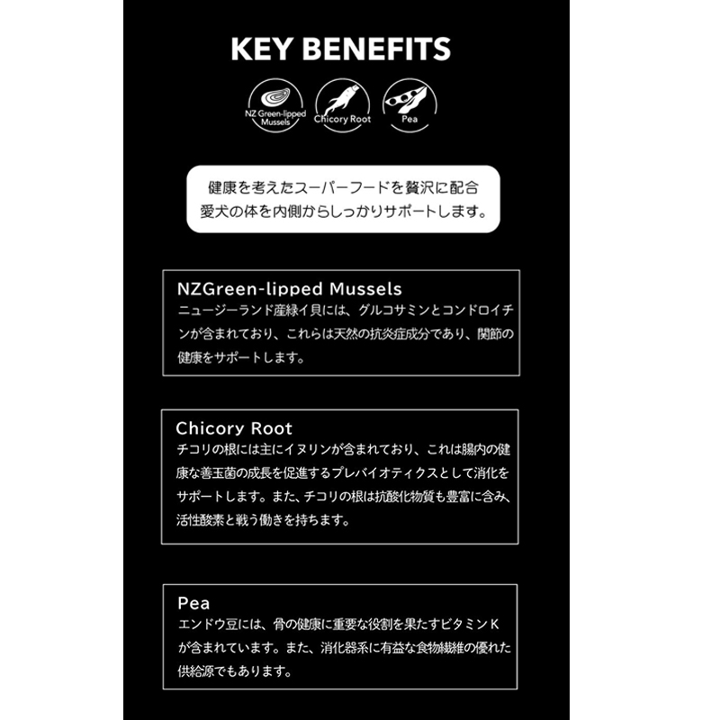 | 素材 | <原材料> チキン、ビーフトライプ、チキンレバー、エンドウ豆、植物性グリセリン、乾燥チコリ、塩、緑イ貝、ニンニク、天然抗酸化物質 <保証成分> 粗たんぱく質36.0%以上、粗脂肪25.0%以上、粗繊維2.0%以下、水分20.0%以下 <エネルギー> 407kcal/100g |