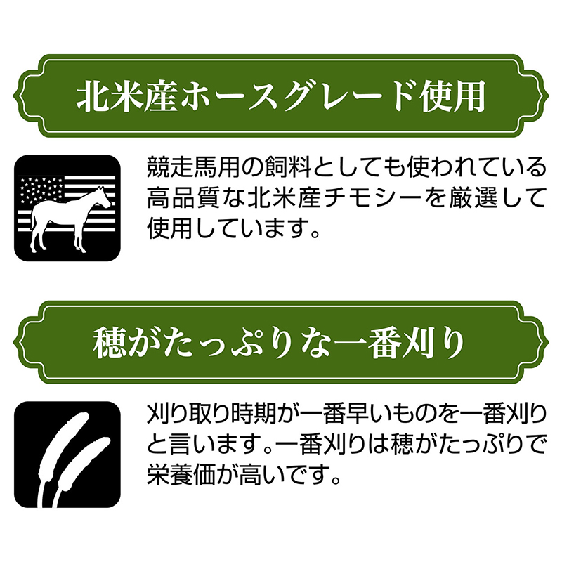| 素材 | <原材料> チモシー <保証成分> たん白質8.0%以上、脂質1.5%以上、粗繊維37.0%以下、灰分7.5%以下、水分10.0%以下 カルシウム0.50%以下、マグネシウム0.20%以下、リン0.30%以下 |