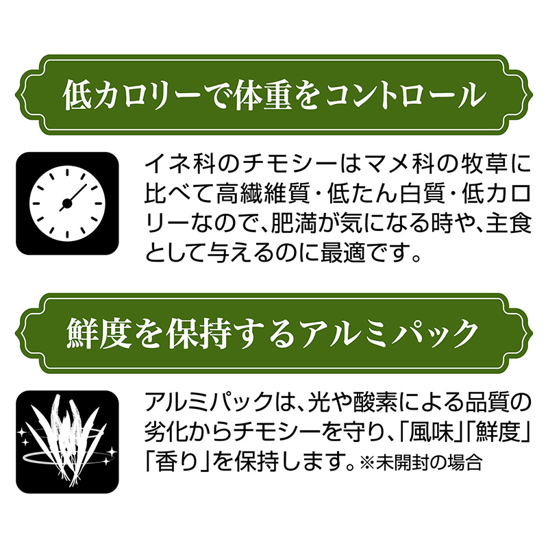 鮮度を保持するアルミパックは、光や酸素による品質の劣化からチモシーを守り、「風味」「鮮度」「香り」を保持します。