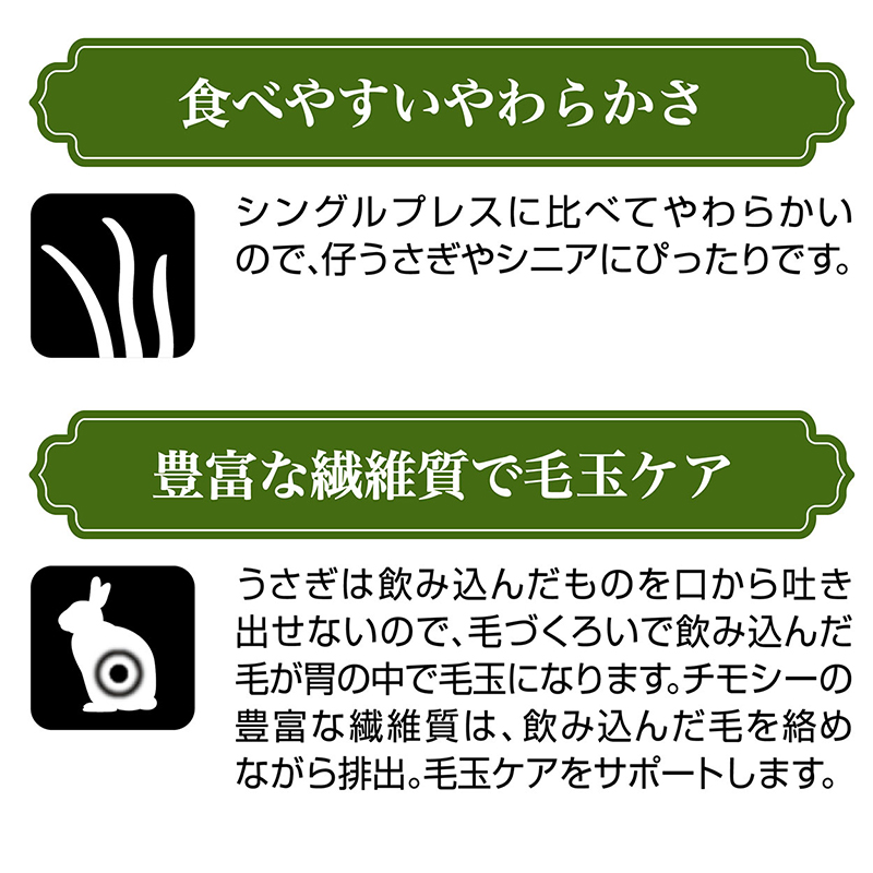 | 素材 | <原材料> チモシー <保証成分> たん白質8.0%以上、脂質1.5%以上、粗繊維37.0%以下、灰分7.5%以下、水分10.0%以下 カルシウム0.50%以下、マグネシウム0.20%以下、リン0.30%以下 |