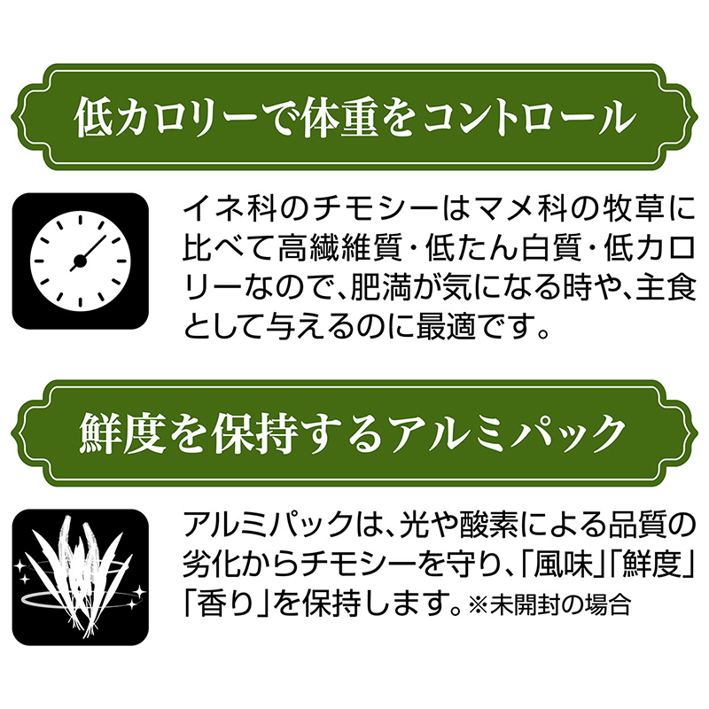 鮮度を保持するアルミパックは、光や酸素による品質の劣化からチモシーを守り、「風味」「鮮度」「香り」を保持します。