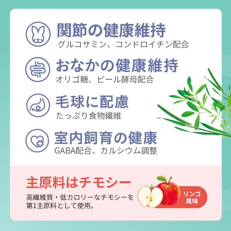 | 素材 | <原材料> チモシーミール、アルファルファミール、アップルファイバー、脱脂大豆、えん麦、でん粉、ブドウ糖、大豆皮、ビール酵母、アップルジュースパウダー、おから、オリゴ糖、植物抽出発酵エキス、乳酸菌加熱菌体(L-137)、GABA、リグノセルロース、ミネラル類(カルシウム、リン、ナトリウム、クロライド、銅、亜鉛、ヨウ素、コバルト)、アミノ酸類(トリプトファン、メチオニン、リジン)、ビタミン類(A、B2、B6、D、E、ナイアシン、パントテン酸、ビオチン、葉酸、コリン)、グルコサミン、コンドロイチン <保証成分> たんぱく質13.0%以上、脂質2.5%以上、粗繊維22.0%以下、灰分9.0%以下、水分10.0%以下、カルシウム0.5%以上、リン0.3%以上 <エネルギー> 250kcal/100g |