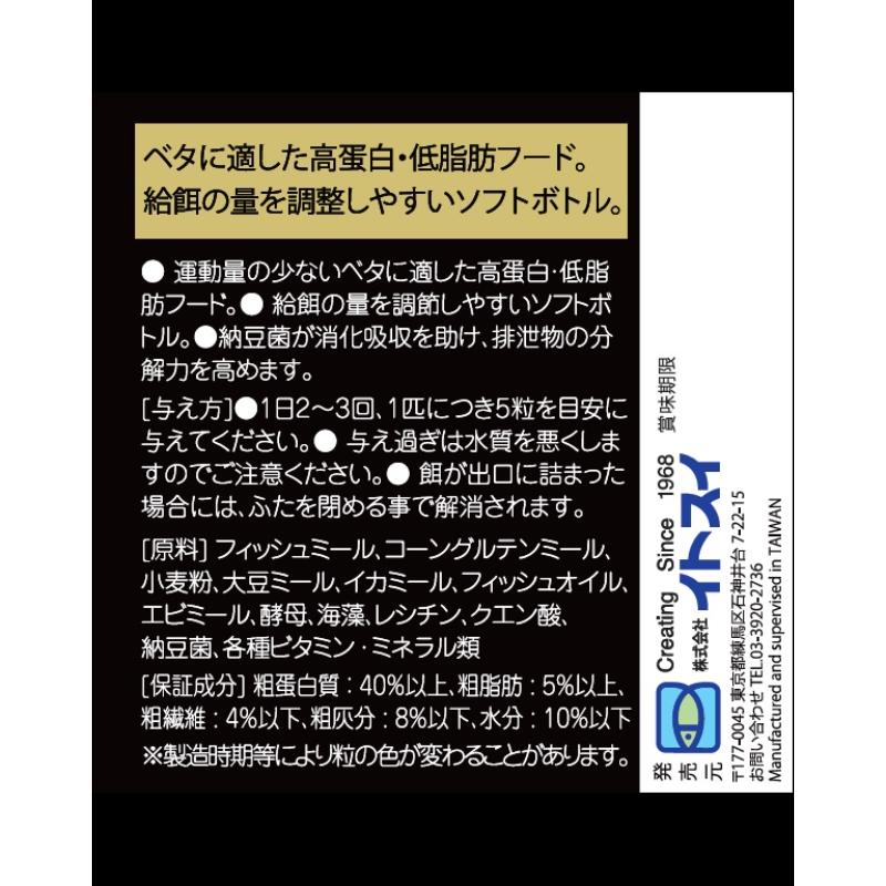 納豆菌配合でベタのフンを軽減し水汚れを抑え、腸内で善玉菌を活性化させ腸内細菌のバランスを整えます。