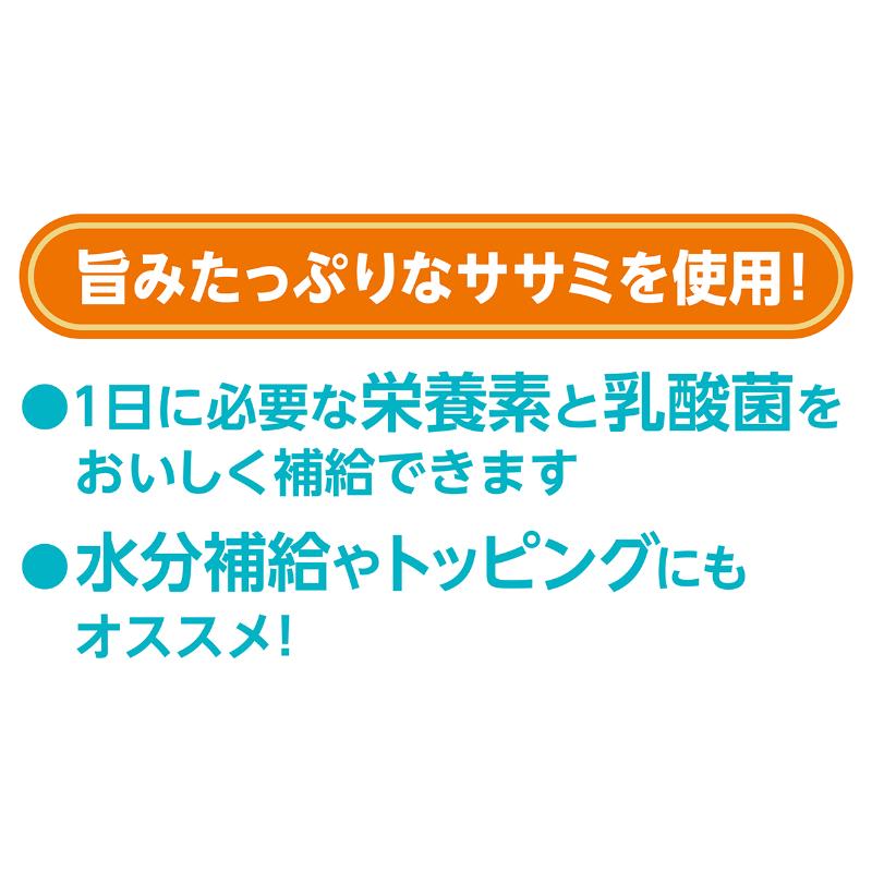 | 素材 | <原材料> 肉類(鶏・鶏レバー・鶏ササミ)、鶏脂、まぐろエキス、チキンエキス、小麦粉、殺菌乳酸菌(プラズマ乳酸菌)、酵母、オリゴ糖、増粘多糖類、ミネラル類(カルシウム・塩素・ナトリウム・リン・亜鉛・鉄・銅・ヨウ素・マンガン・コバルト・ケイ素)、ビタミン類(A・B1・B2・B6・B12・C・D・E・ナイアシン・パントテン酸・コリン)、タウリン、メチオニン <保証成分> たん白質7.5%以上、脂質1.0%以上、粗繊維1.0%以下、灰分2.5%以下、水分88.0%以下、カルシウム0.06%以上、リン0.05%以上、ビタミンA:600IU以上、ビタミンB1:0.27mg以上、ビタミンD:60IU以上、リノール酸0.14%以上 <エネルギー> 68kcal/100g |