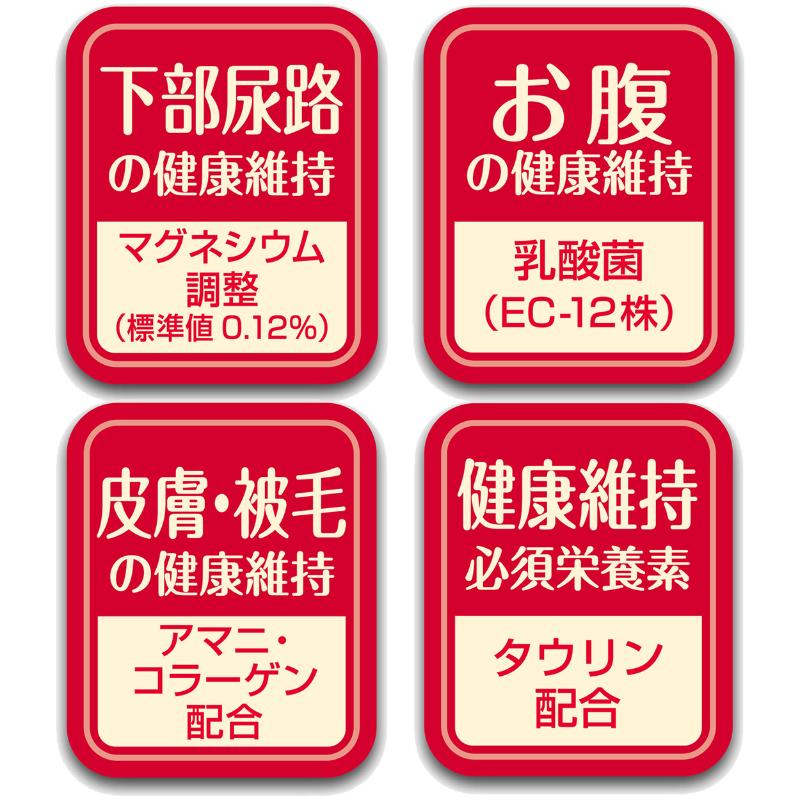| 素材 | <原材料> 穀類(とうもろこし・コーングルテンミール・小麦粉等)、肉類(チキンミール・チキンエキス・チキンレバーパウダー・ビーフパウダー・ささみパウダー等)、動物性油脂、魚介類(魚粉・フィッシュエキス・まぐろ粉末・かつお粉末・白身魚ミール等)、おから、殺菌乳酸菌(プラズマ乳酸菌・EC-12株)、オリゴ糖、アマニ、コラーゲン、ミネラル類(Na・Cl・K・Ca・P・Zn・Fe・Mn・Cu・Co・I)、ビタミン類(A・B1・B2・B6・B12・C・D3・E・K3・コリン・ニコチン酸・パントテン酸・葉酸・ビオチン)、アミノ酸類(メチオニン・リジン・トリプトファン・タウリン)、酸化防止剤(V.E・ハーブ抽出物) <保証成分> たん白質28.0%以上、脂質8.0%以上、粗繊維4.5%以下、灰分9.0%以下、水分10.0%以下、カルシウム0.90%以上、リン0.72%以上、ビタミンA:6002IU以上、ビタミンB1:5.04mg以上、ビタミンD:252IU以上、リノール酸0.54%以上、マグネシウム0.12%(標準値) <エネルギー> 335kcal/100g |