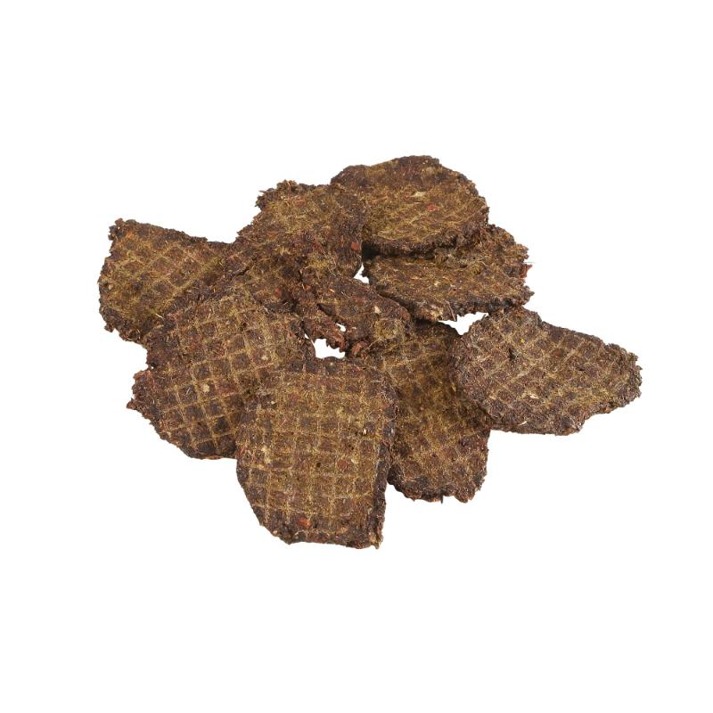 ・エゾシカ肉のミンチに、グリーントライプ(胃袋、胃内膜、胃内容物草)をミックスして75℃でじっくり乾燥させた犬用おやつです。