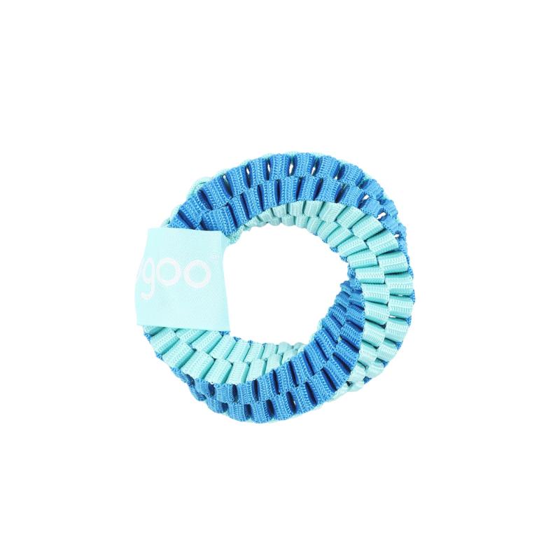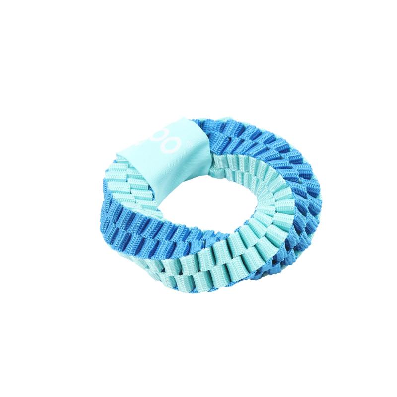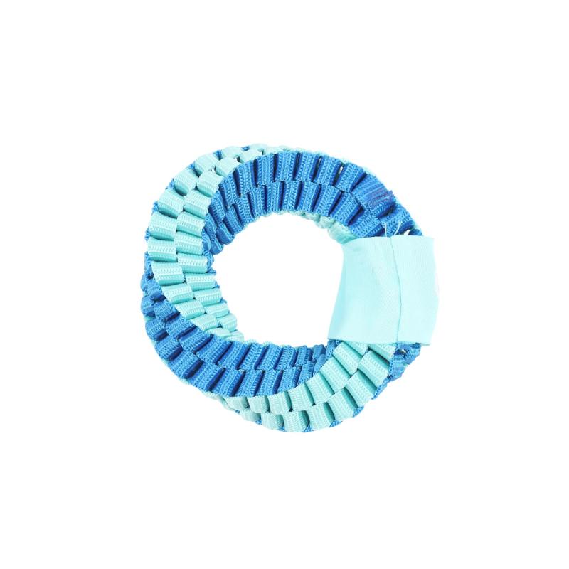丈夫なナイロンテープを2重の輪つなぎのように編んだ不思議な形の犬用おもちゃです。