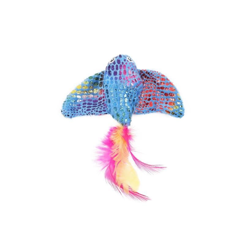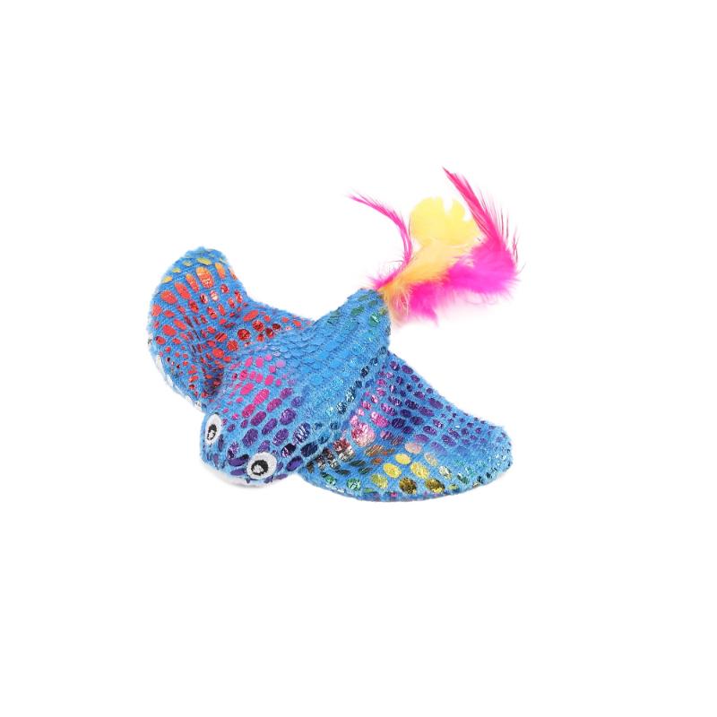 ・猫の狩猟本能を刺激する、お魚モチーフのフェザー付きキャットトイです。