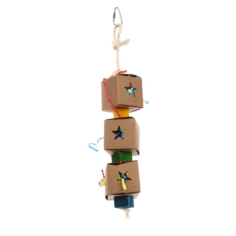 ・3つの紙箱がサイザル(植物繊維)で作られたヒモでつながっています。箱の中にはカラフルな細かい短冊状の紙が入っていて、鳥が餌や巣材を探したり、虫を突いたりする本能を刺激します。