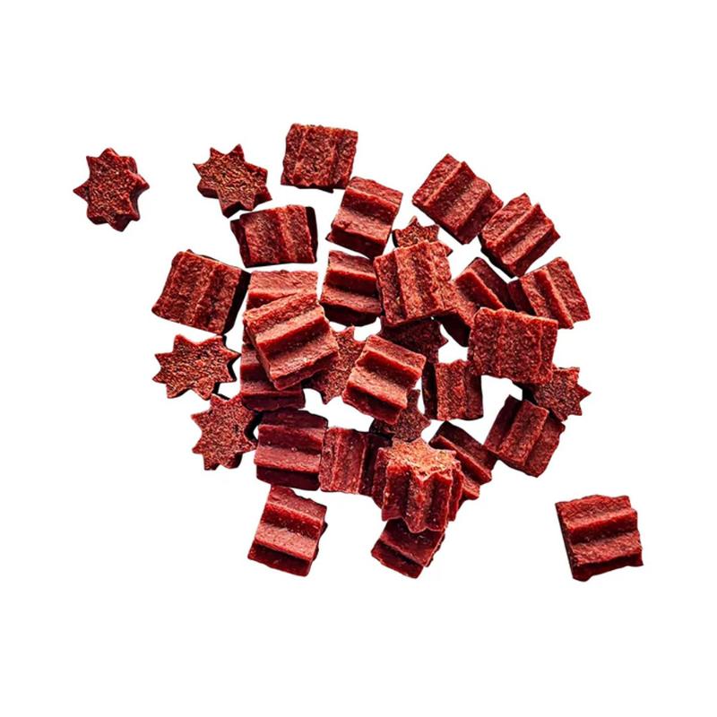 | 素材 | <原材料> サメ肉、小麦グルテン、保存料(グリセリン、ソルビン酸カリウム、安息香酸ナトリウム)、香料(ストロベリー)、着色料(食用赤色102号) <保証成分> 粗タンパク質19%以上、粗脂肪2%以上、粗繊維0.7%以下、粗灰分2.8%以下、水分13%以下 <エネルギー> 389kcal/100g |
