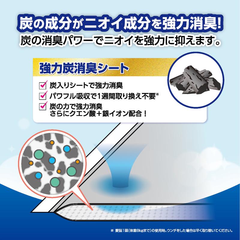 ・排泄のニオイやシートからのおしっこ漏れを防ぐために、愛猫1頭の場合、1週間に1回は新しい「デオフリーシステムトイレ用強力炭消臭シート」に交換してください。