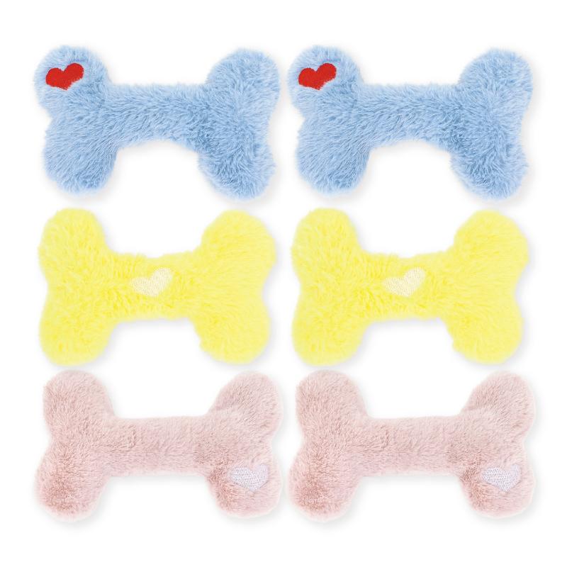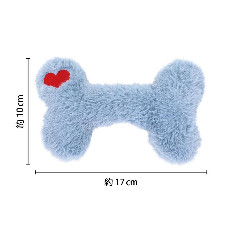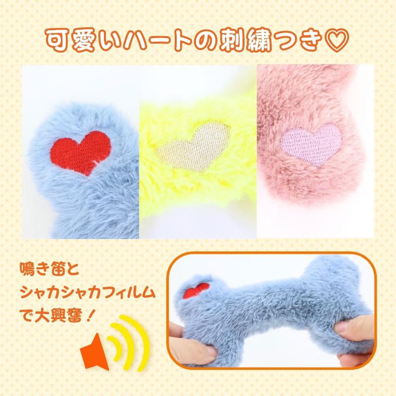 可愛いハートの刺繍、鳴き笛とシャカシャカフィルムで大興奮、咥えやすい骨型おもちゃです。