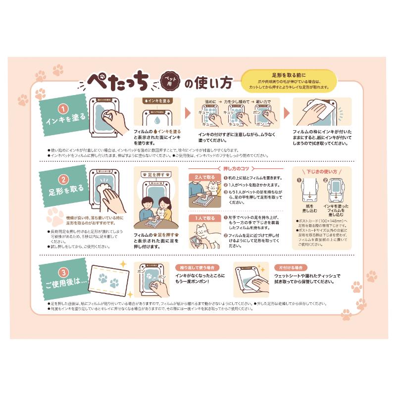 ・インキが下に塗られたフィルムの上から足を押すことで、大切なペットやお部屋を汚す心配なく、思い出を彩る作品づくりを楽しむことができます。