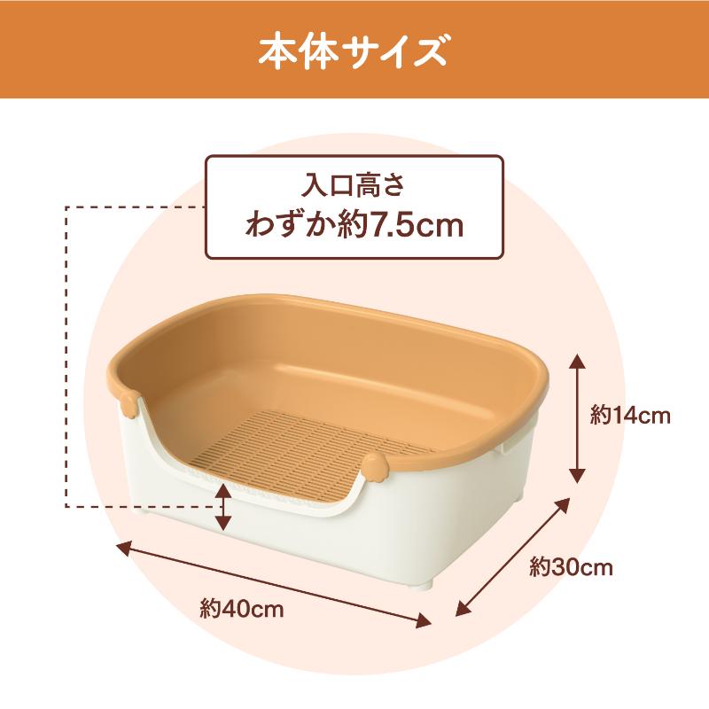 | サイズ | パッケージサイズ:W413×H158×D317mm/重量2600g 本体サイズ:トイレサイズ:約幅40×奥行30×高さ14(cm) 入口の高さ:約7.5cm |