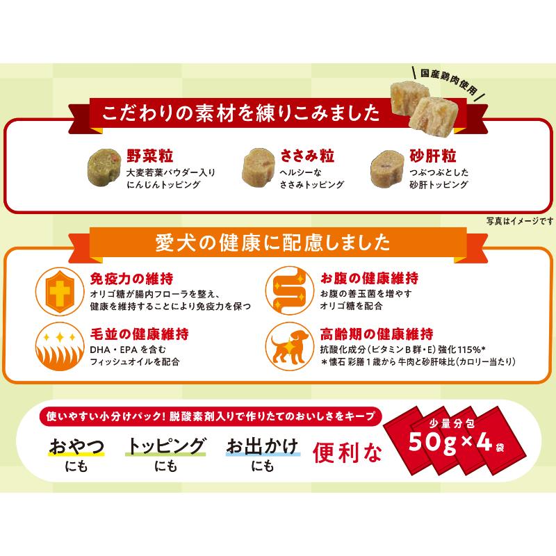 ・大麦若葉パウダー入りのにんじんトッピング「野菜粒」、ヘルシーなささみトッピング「ささみ粒」、つぶつぶとした砂ぎもトッピング「砂ぎも粒」、ささみさまざまな素材を練り込みました。