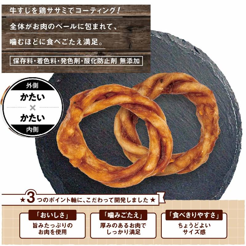 ・しなやかさが特徴の牛すじを使用したガムをリング状に成形し、ササミをディップしたハードタイプのおいしいおやつです。噛めば噛むほど素材の旨みがあふれ出します。