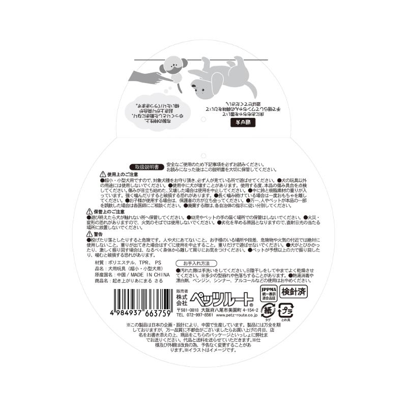 | 注意事項 | ※重りが入っています。危険ですので、投げたり叩いたりしないでください。重りが出てきた場合は使用を中止してください。※パリパリフィルムを使用しています。遊び方や力によって破損することがあります。本品が傷みはじめたら使用を中止してください。 ・超小型・小型犬用ですので、対象犬種をお守り頂き、必ず人が見ている所で遊ばせてください。 ・使用中に犬が壊すことがあります。使用する度、本品の傷み具合を点検してください。傷みが目立ち始めた、又壊した場合は使用を中止してください。 ・強く噛んだりすると破損する恐れがあります。 ・長く噛み続けている場合は一度おもちゃを離してください。 ・お子様が使用する場合は、保護者の方が立ち会ってください。 ・万一、人やペットが本品の一部を誤飲した場合は各医師にご相談ください。 ・廃棄する際は、各自治体の指示に従い分別してください。 |