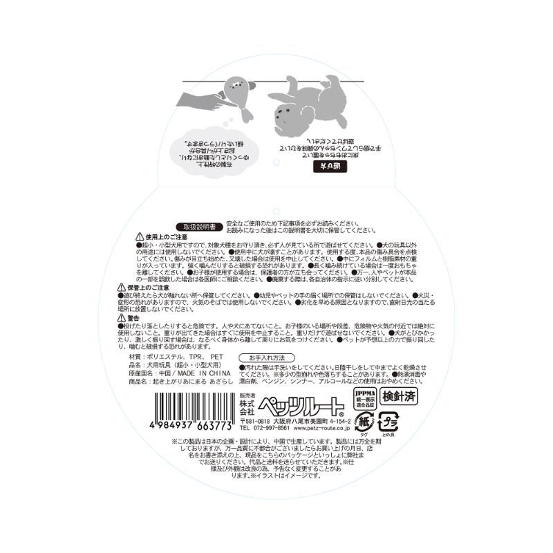 | 注意事項 | ※重りが入っています。危険ですので、投げたり叩いたりしないでください。重りが出てきた場合は使用を中止してください。※パリパリフィルムを使用しています。遊び方や力によって破損することがあります。本品が傷みはじめたら使用を中止してください。 ・超小型・小型犬用ですので、対象犬種をお守り頂き、必ず人が見ている所で遊ばせてください。 ・使用中に犬が壊すことがあります。使用する度、本品の傷み具合を点検してください。傷みが目立ち始めた、又壊した場合は使用を中止してください。 ・強く噛んだりすると破損する恐れがあります。 ・長く噛み続けている場合は一度おもちゃを離してください。 ・お子様が使用する場合は、保護者の方が立ち会ってください。 ・万一、人やペットが本品の一部を誤飲した場合は各医師にご相談ください。 ・廃棄する際は、各自治体の指示に従い分別してください。 |