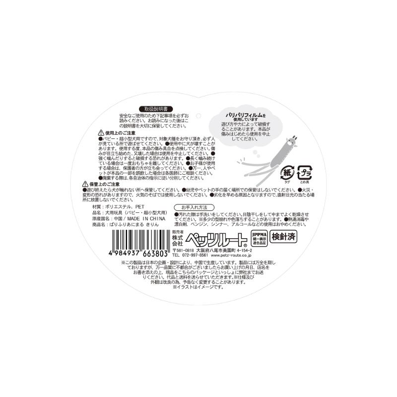 | 注意事項 | ※パリパリフィルムを使用しています。遊び方や力によって破損することがあります。本品が傷みはじめたら使用を中止してください。 ・パピー・超小型犬用ですので、対象犬種をお守り頂き、必ず人が見ている所で遊ばせてください。 ・使用中に犬が壊すことがあります。使用する度、本品の傷み具合を点検してください。傷みが目立ち始めた、又壊した場合は使用を中止してください。 ・強く噛んだりすると破損する恐れがあります。 ・長く噛み続けている場合は一度おもちゃを離してください。 ・お子様が使用する場合は、保護者の方が立ち会ってください。 ・万一、人やペットが本品の一部を誤飲した場合は各医師にご相談ください。 ・廃棄する際は、各自治体の指示に従い分別してください。 |