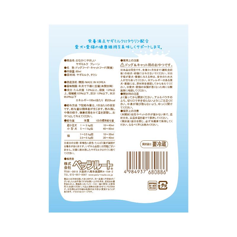 | 素材 | <原材料> ヤギミルク、タウリン <保証成分> たんぱく質1.0%以上、脂質1.0%以上、粗繊維0.5%以下、灰分1.0%以下、水分95.0%以下 <エネルギー> 約32kcal/100ml |