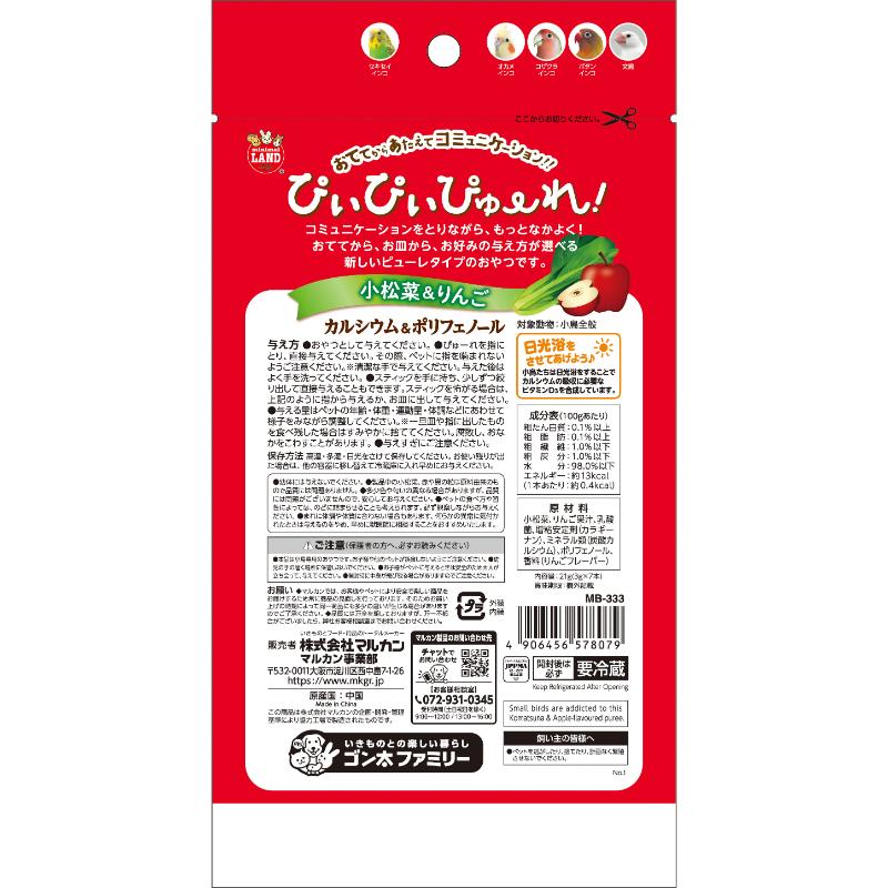 ・小鳥用の小松菜&りんごのぴゅーれです。手から与えてコミュニケーションを取ることができます。