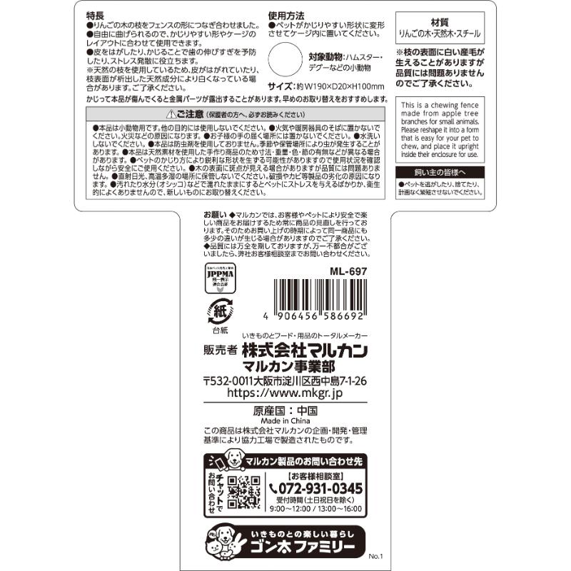 | 注意事項 | ・本品は小動物用です。他の目的には使用しないでください。 ・火気や暖房器具のそばに置かないでください。火災などの原因になります。 ・お子様の手の届く場所には置かないでください。 ・水洗いしないでください。 ・本品は防虫剤を使用しておりません。季節や保管場所により虫が発生することがあります。 ・本品は天然素材を使用した手作り商品のため寸法・重量・色・節の有無などが異なる場合があります。 ・ネジの締めすぎにはご注意ください。ケージや本品の破損につながります。 ・ペットのかじり方により鋭利な形状を生ずる可能性がありますので使用状況を確認しながら安全にご使用ください。 ・木の表面に斑点が見える場合がありますが品質には問題ありません。 ・直射日光、高温多湿の場所に保管しないでください。破損やカビ等製品の劣化の原因になります。 ・汚れたり水分(オシッコ)などで濡れたままにするとペットにストレスを与えるばかりか、衛生的によくありませんので、新しいものにお取り替えください。 ※天然の枝を使用しているため、皮がはがれていたり、枝表面が析出した天然成分により白くなっている場合があります。ご了承ください。 ※かじって本品が傷んでくると金属パーツが露出することがあります。早めのお取替えをおすすめします。 |