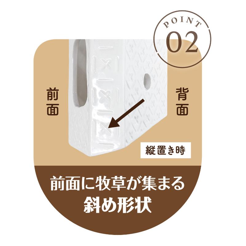 ・縦での使用の際には牧草が前方に集まるように傾斜があり、牧草くずが落ちやすいスリットが底についています。