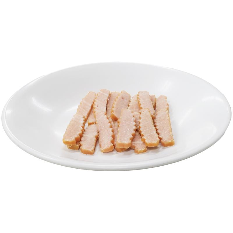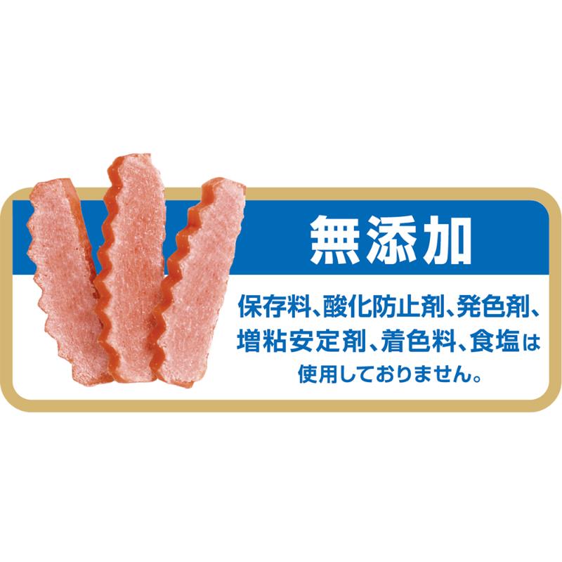 | 素材 | <原材料> 鶏ささみ、小麦粉、鶏レバー、サーモンオイル(EPA・DHA含有)、コエンザイムQ10、ミルクカルシウム、グリセリン(植物性) <保証成分> たんぱく質20.5%以上、脂質1.5%以上、粗繊維0.5%以下、灰分1.5%以下、水分43.0%以下、ナトリウム0.05%以下 <エネルギー> 240kcal/100g |