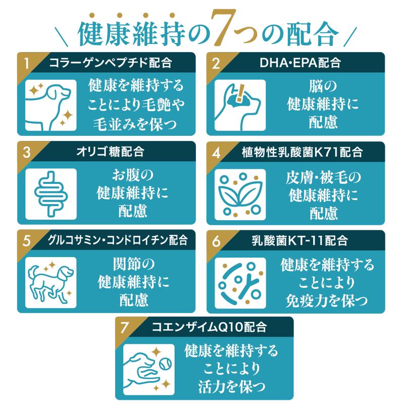 ・高齢期の健康に配慮し、コラーゲンペプチド、DHA・EPA、オリゴ糖、植物性乳酸菌K71、グルコサミン・コンドロイチン、乳酸菌KT-11、コエンザイムQ10を配合しました。