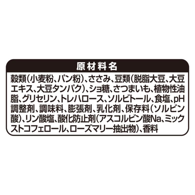 | 素材 | <原材料> 穀類(小麦粉、パン粉)、ささみ、豆類(脱脂大豆、大豆エキス、大豆タンパク)、ショ糖、さつまいも、植物性油脂、グリセリン、トレハロース、ソルビトール、食塩、pH調整剤、調味料、膨張剤、乳化剤、保存料(ソルビン酸)、リン酸塩、酸化防止剤(アスコルビン酸Na、ミックストコフェロール、ローズマリー抽出物)、香料 <保証成分> タンパク質16.0%以上、脂質1.0%以上、粗繊維2.0%以下、粗灰分5.0%以下、水分25.0%以下 <エネルギー> 約290kcal/100g |