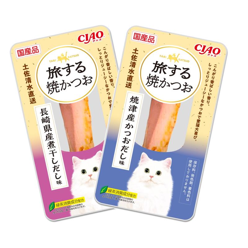 | 素材 | <原材料> <焼津産かつおだし味> 宗田鰹、かつお節エキス、ビタミンE、緑茶エキス <長崎県産煮干しだし味> 宗田鰹、煮干だし、ビタミンE、緑茶エキス <保証成分> たんぱく質28.0%以上、脂質2.8%以上、粗繊維0.1%以下、灰分1.8%以下、水分67.0%以下 <エネルギー> 約20kcal/本 |