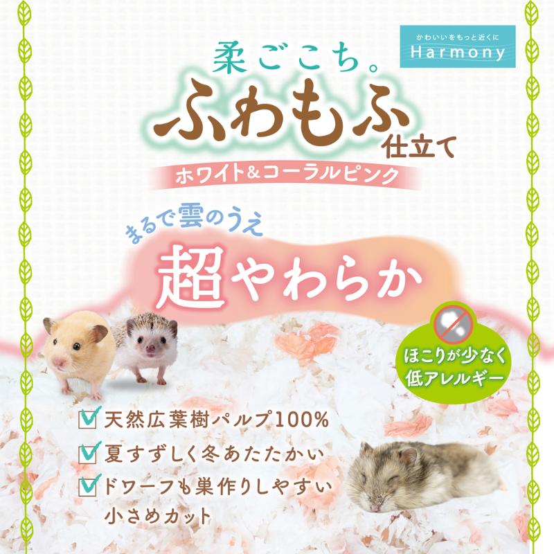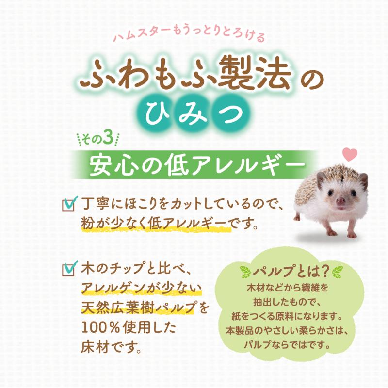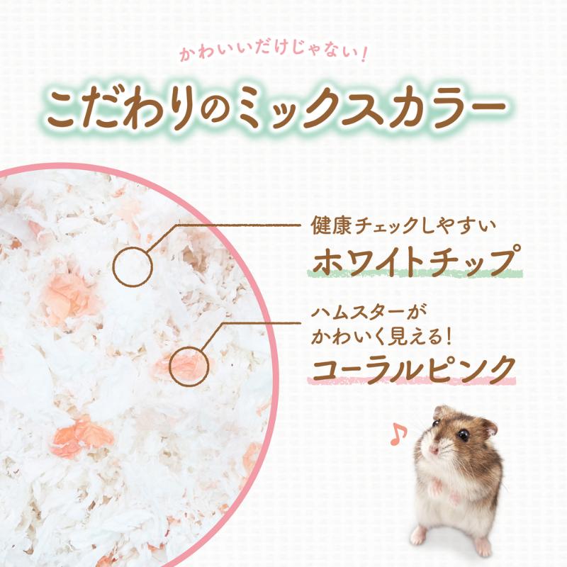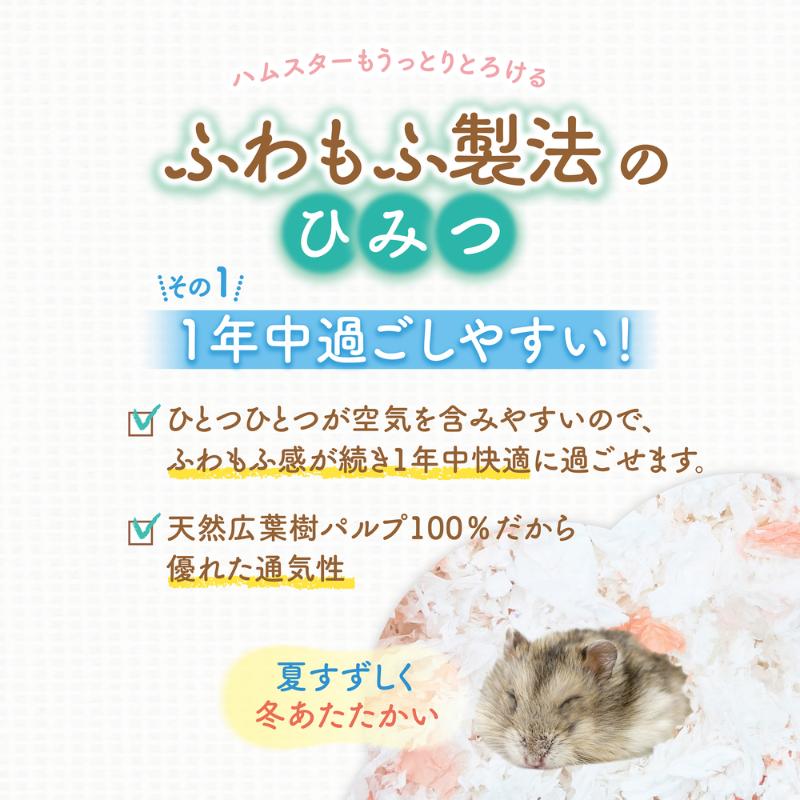 ・野生のハムスターは巣材を噛みほぐして巣を作る習性を持っています。床材をほぐさない状態で与えると噛みほぐしができるので、本能が満たされストレス解消にもつながります。