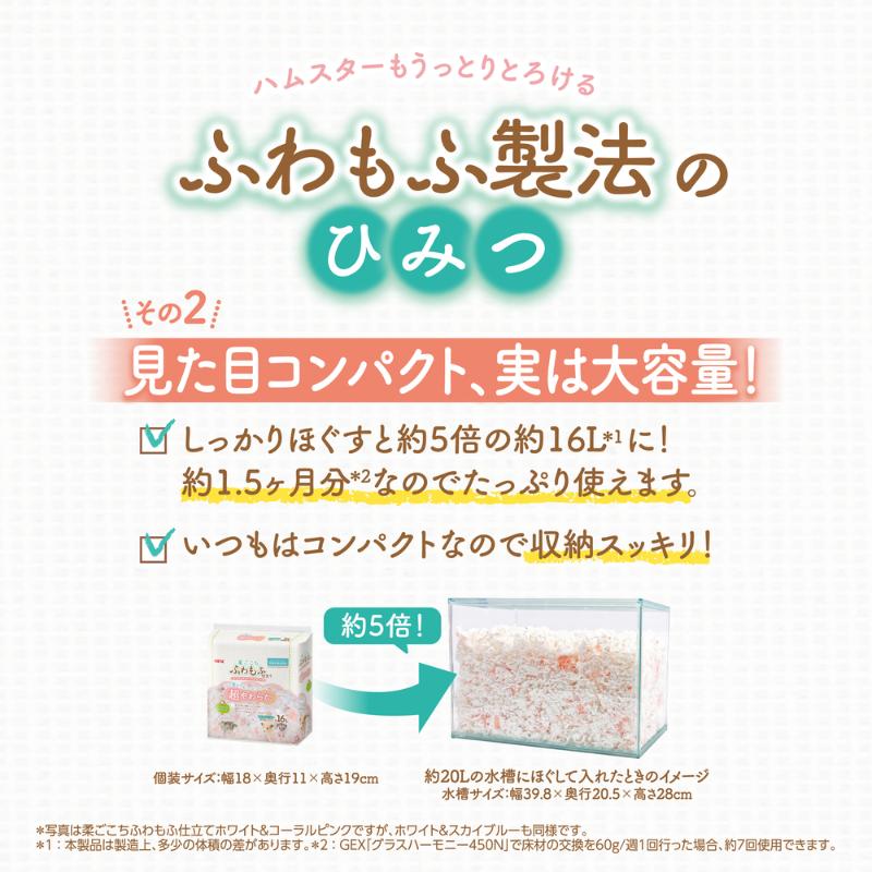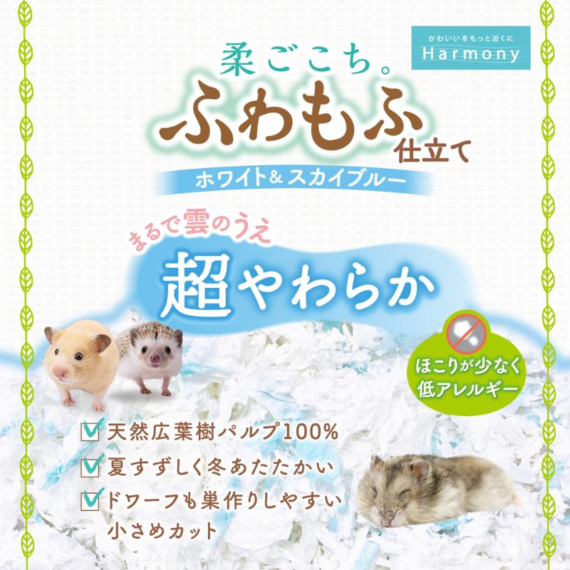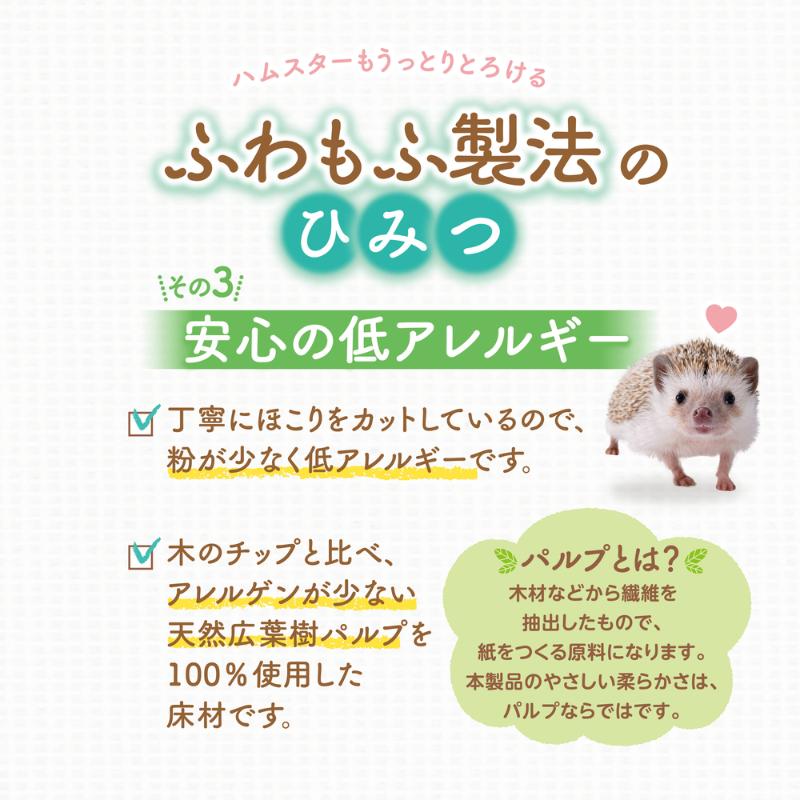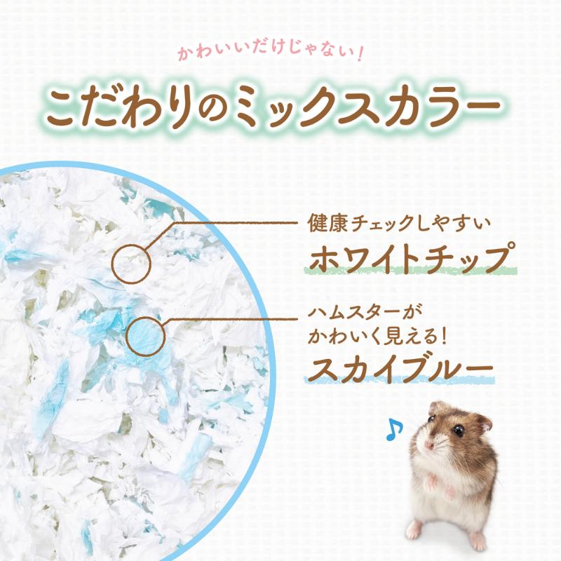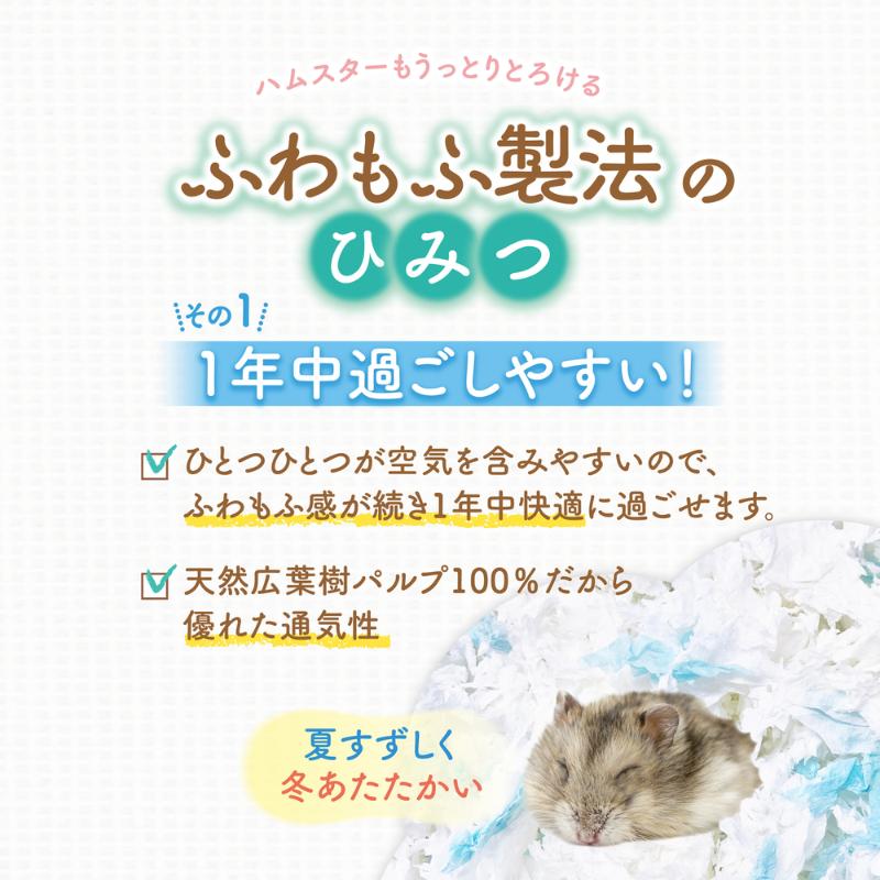 ・野生のハムスターは巣材を噛みほぐして巣を作る習性を持っています。床材をほぐさない状態で与えると噛みほぐしができるので、本能が満たされストレス解消にもつながります。