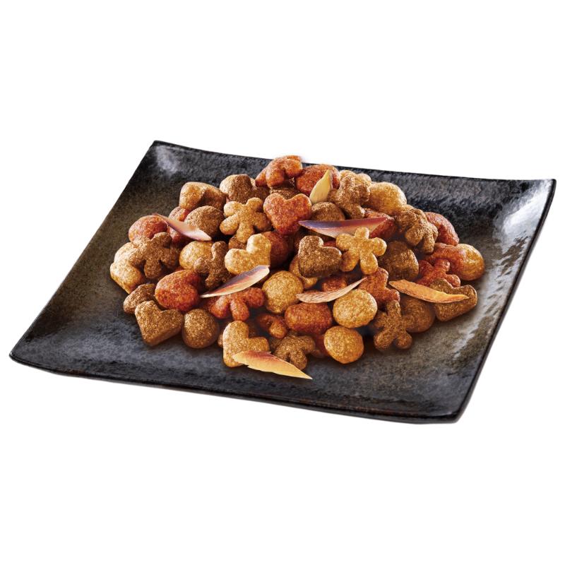 | 素材 | <原材料> 穀類(とうもろこし、とうもろこしたんぱく、米、小麦、オーツ麦等)、肉類(チキンミール等)、大豆粉、動物性油脂、食物繊維、たんぱく加水分解物、魚介類(まぐろ、かつお、かつお節、かつおだしパウダー)、フレーバーブレンド、ミネラル類(カルシウム、リン、カリウム、ナトリウム、クロライド、鉄、銅、マンガン、亜鉛、ヨウ素、セレン)、ビタミン類(A、E、K、B1、B2、パントテン酸、ナイアシン、B6、葉酸、ビオチン、B12、コリン)、アミノ酸類(メチオニン、タウリン)、着色料(カラメル色素、カロテノイド色素) <保証成分> たんぱく質30%以上、脂質12.5%以上、粗繊維7.5%以下、灰分9%以下、水分12%以下 <エネルギー> 約360kcal/100g(約68kcal/小袋19g) |
