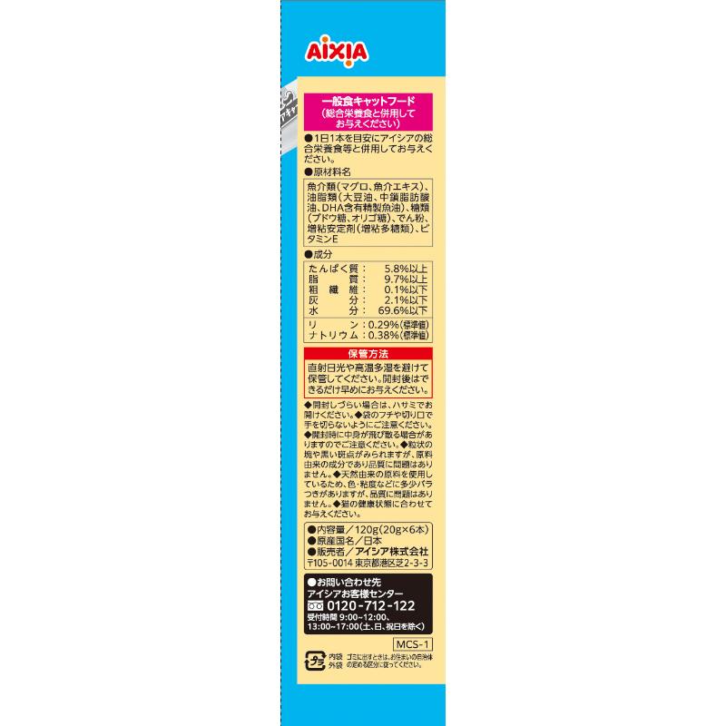 | 素材 | <原材料> 魚介類(マグロ、魚介エキス)、油脂類(大豆油、中鎖脂肪酸油、DHA含有精製魚油)、糖類(ブドウ糖、オリゴ糖)、でん粉、増粘安定剤(増粘多糖類)、ビタミンE <保証成分> たんぱく質5.8%以上、脂質9.7%以上、粗繊維0.1%以下、灰分2.1%以下、水分69.6%以下 <エネルギー> 37kcal/本 |