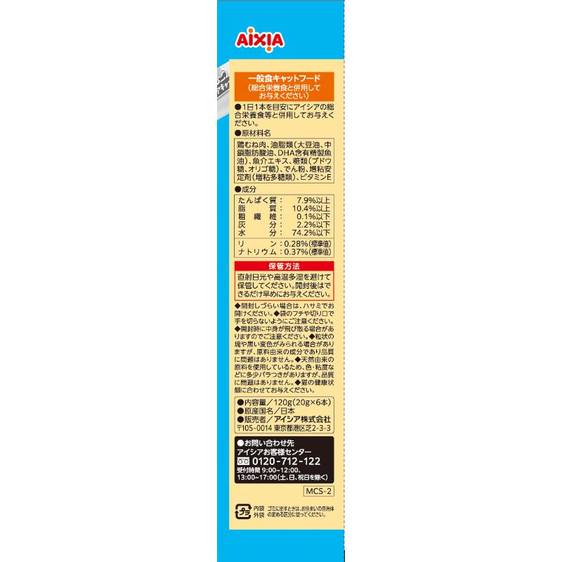 | 素材 | <原材料> 鶏むね肉、油脂類(大豆油、中鎖脂肪酸油、DHA含有精製魚油)、魚介エキス、糖類(ブドウ糖、オリゴ糖)、でん粉、増粘安定剤(増粘多糖類)、ビタミンE <保証成分> たんぱく質7.9%以上、脂質10.4%以上、粗繊維0.1%以下、灰分2.2%以下、水分74.2%以下 <エネルギー> 37kcal/本 |